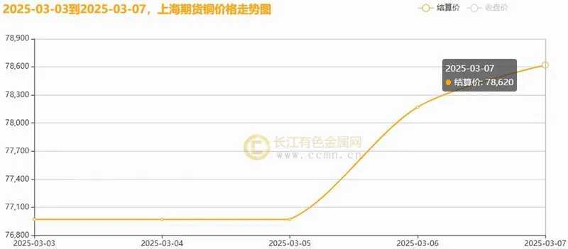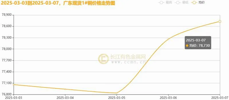 3月7日当周,国内现货铜价偏强上行。长江有色金属网数据显示,长江现货1#铜均价报77658元/吨,日均上涨392元/吨;此前一周均价报77016元/吨,环比上周均价上涨0.83%。广东现货1#铜均价报77566元/吨,日均上涨376元/吨,此前一周均价报76980元/吨,环比上周均价上涨0.76%。