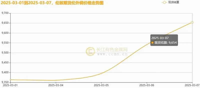 CCMN数据显示,本周伦铜价格反弹上行。前四个交易日LME期铜均价报9517.5美元/吨,日均上涨82美元/吨;上周均价报9433.25美元/吨,环比上周均价上涨0.90%。